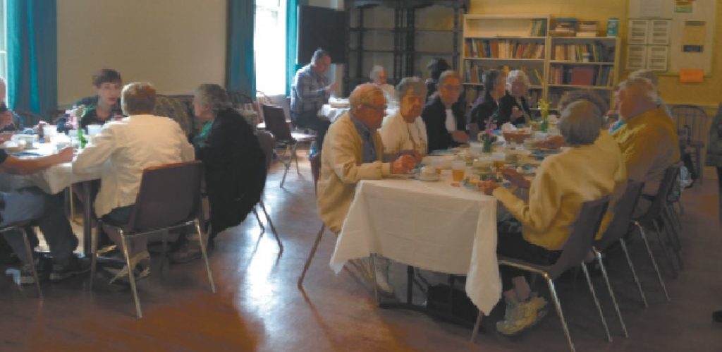 Parishioners enjoy a meal with friends and neighbors at the Brookline Community Church.
