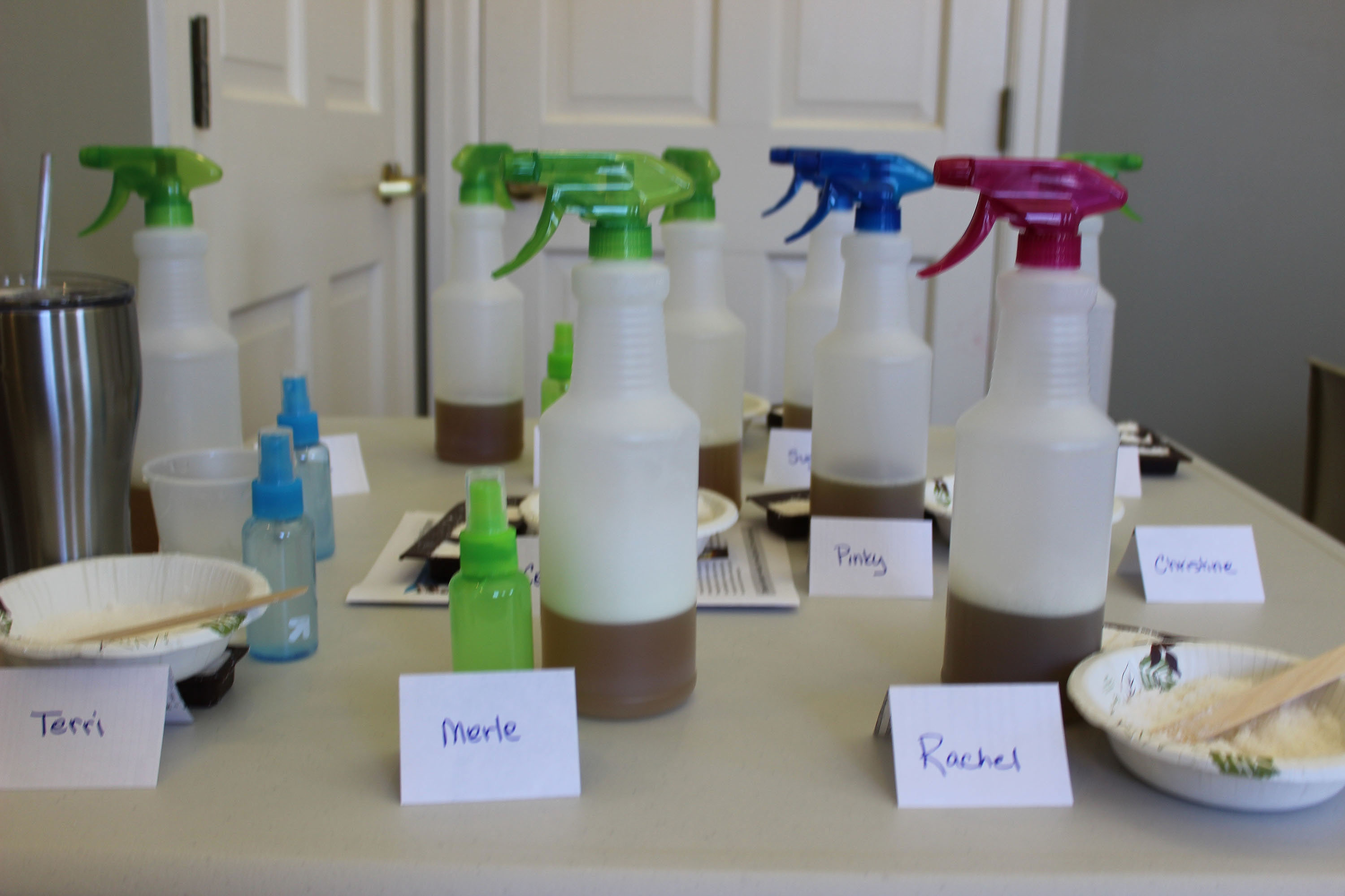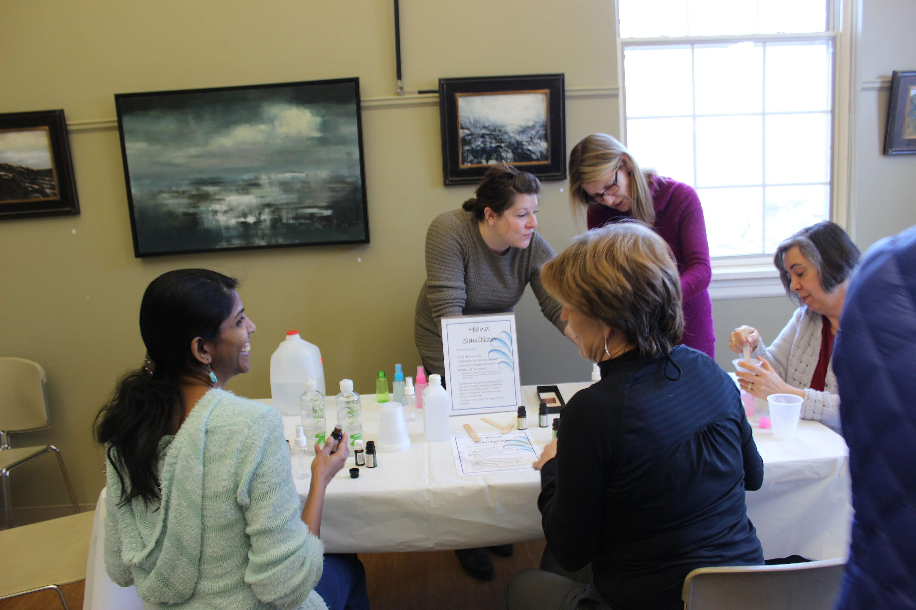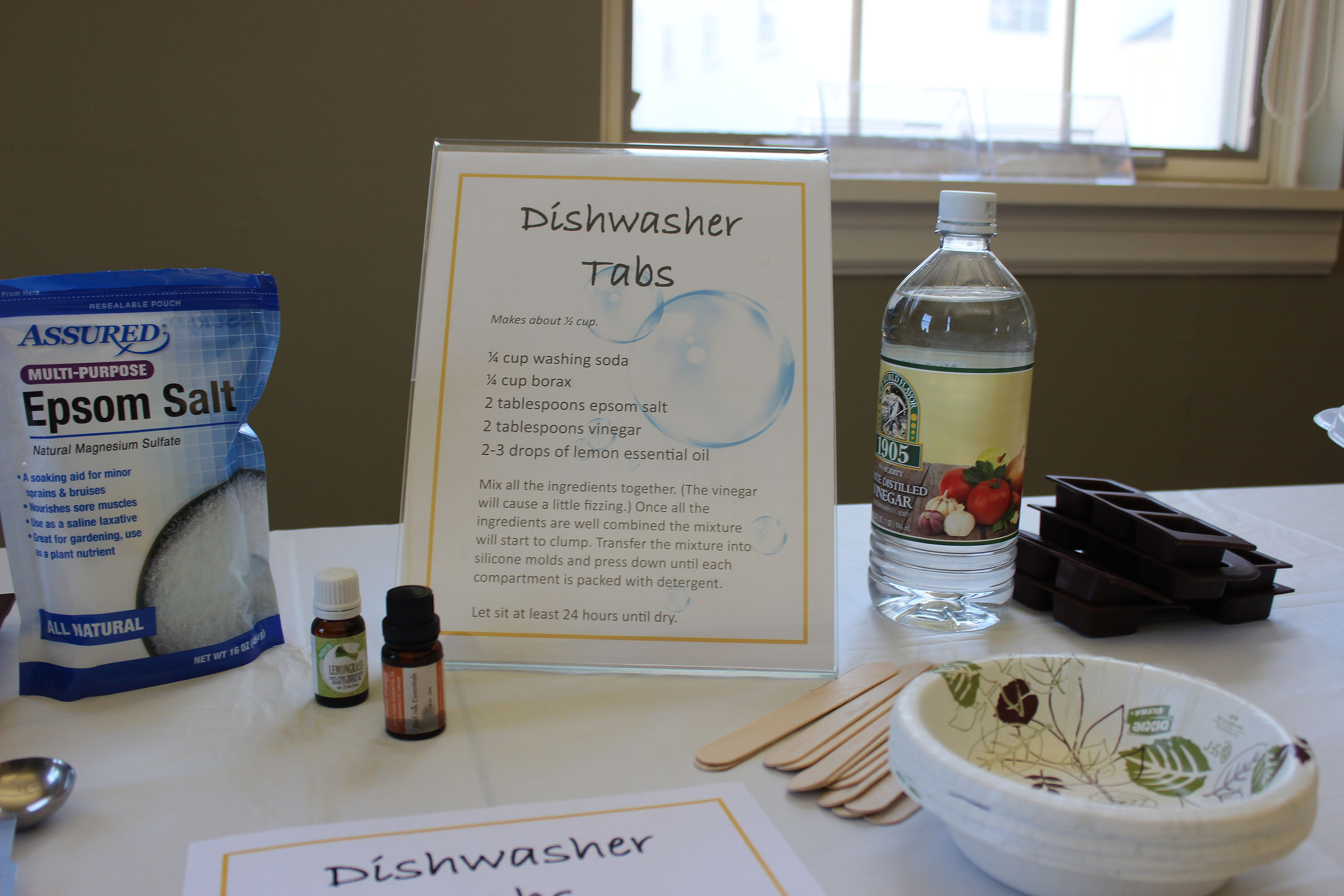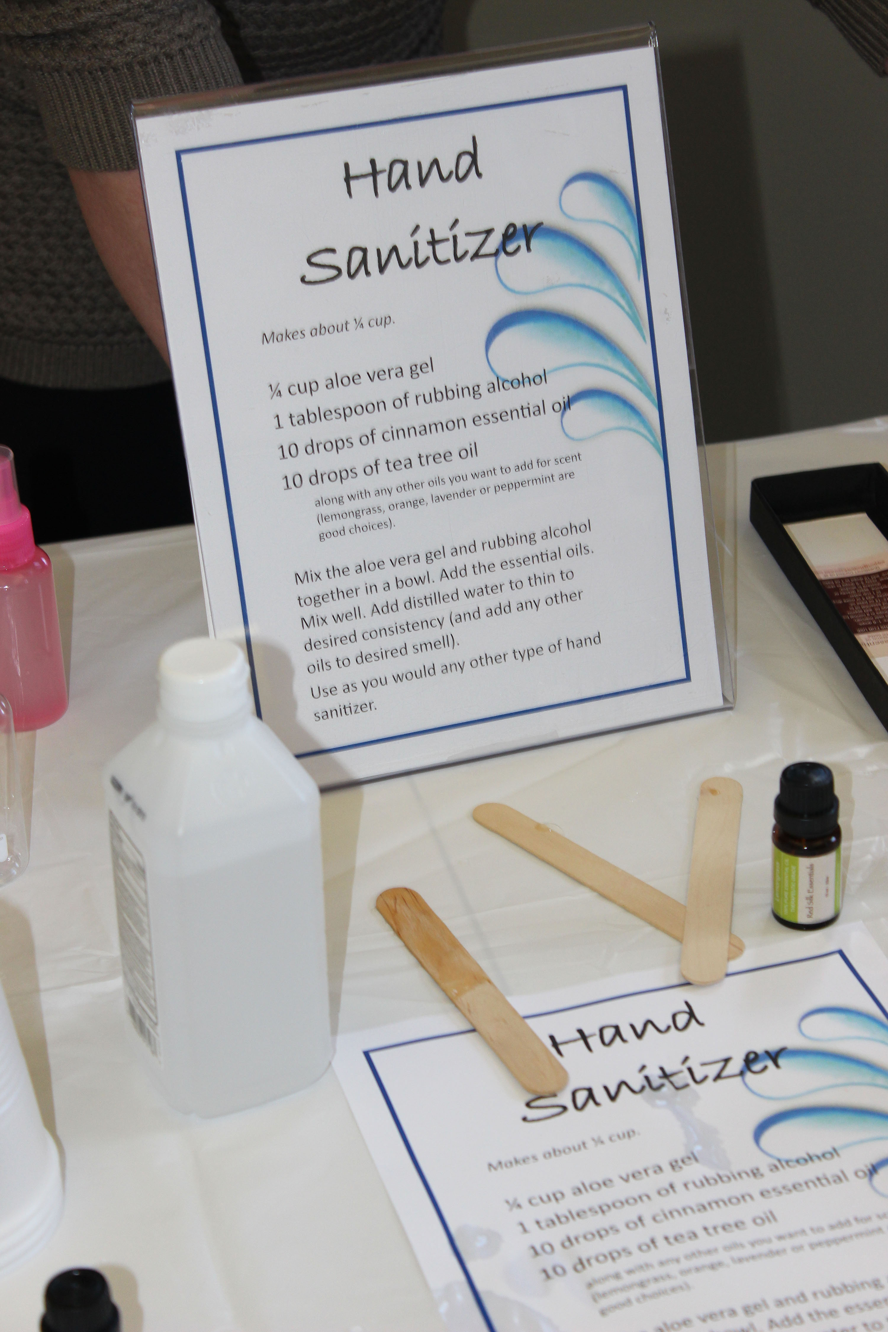 There were three tables in the room, each devoted to a separate cleaning product, with recipes and ingredients for a hand sanitizer, dishwasher tabs and thyme counter cleaner, along with mixing and storing containers and stirring sticks. Each product took only minutes to compose and was ready to use, except for the dishwasher cubes, which needed to sit in their ice trays overnight to harden.