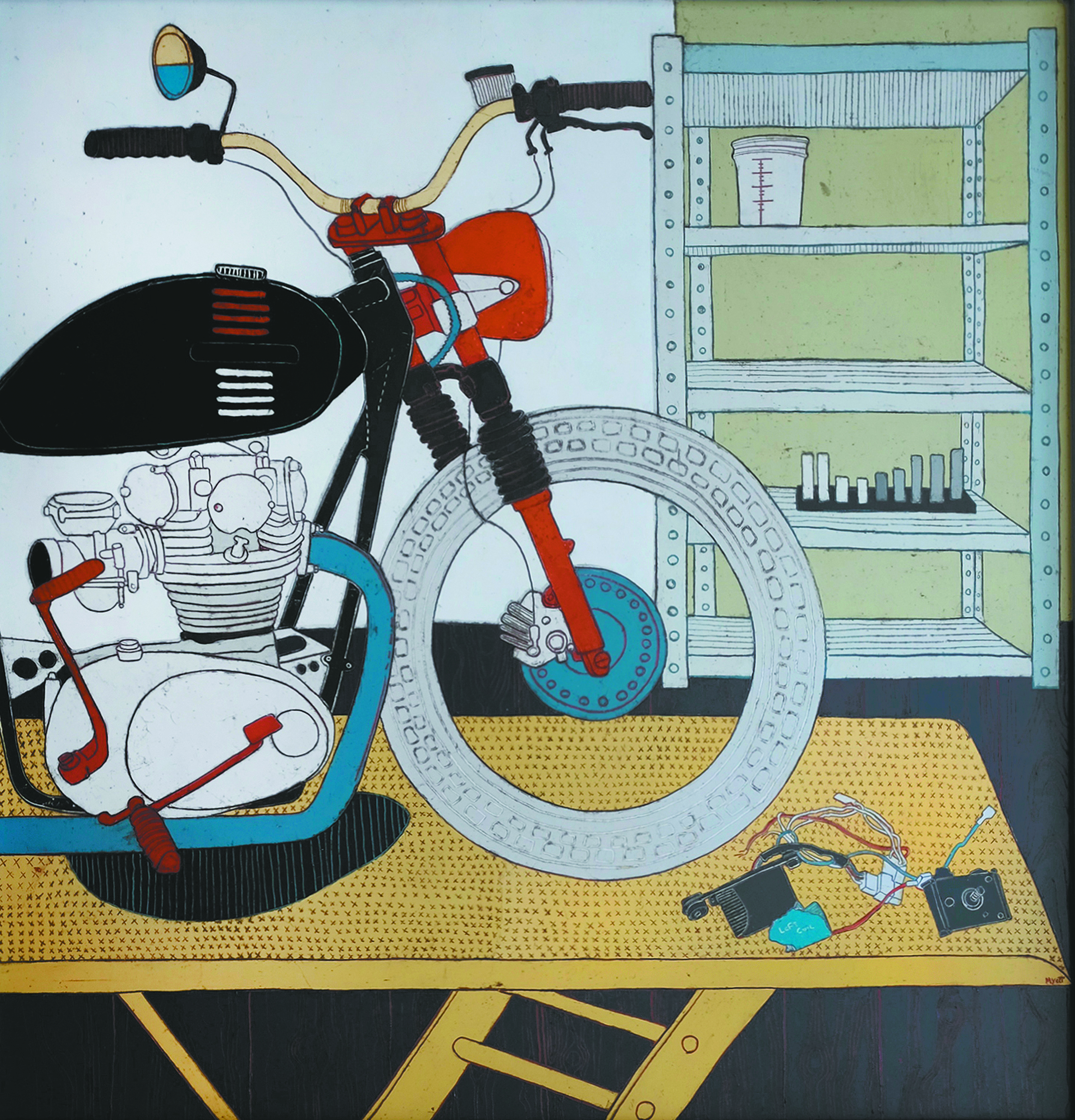 In 2005, Myott received a BS in studio arts at Chester College, and thereafter he spent two years living and working in Boston. After an apprenticeship at Boston’s Institute of Contemporary Art, Myott returned to the Monadnock Region, where he currently lives. He works out of his three-story barn studio, which is dedicated to making paintings, creating furniture and rebuilding vintage motorcycles.