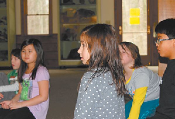 Photo by KATHY CLEVELAND The Fairy Tale Theater program attracts about a dozen kids to the Saturday morning sessions. From left are Ben Jones, Maggie Loi and Elena Orrego, all of Amherst; Sydney Geddes, of Temple; and Edgar Christian, of Amherst.