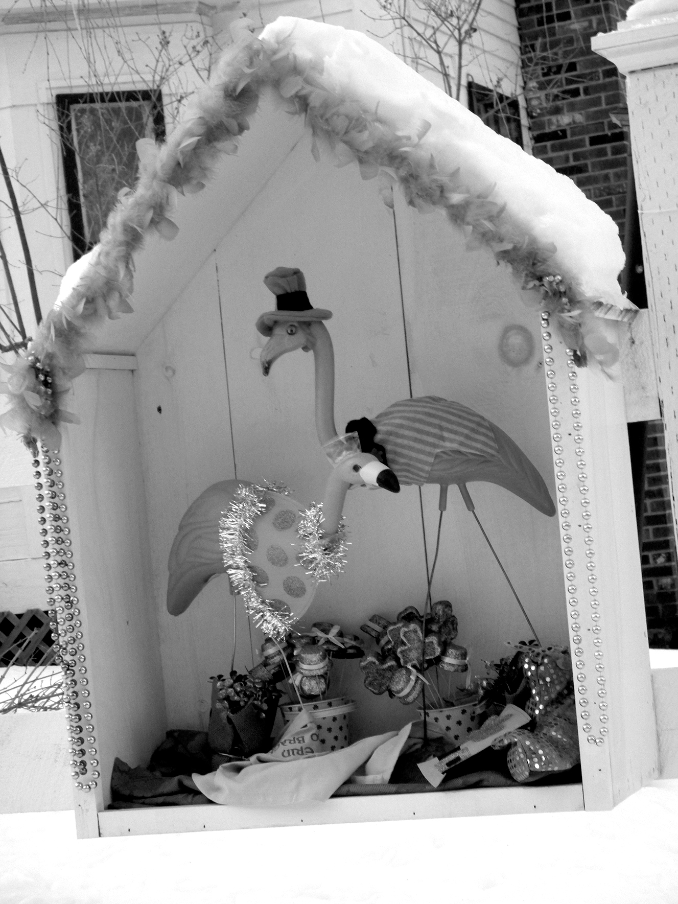 As far as we know there, are no wild flamingos in Ireland (although there were nine flamingo chicks born in the Dublin Zoo last summer), but everyone was Irish on Sunday, St. Patrick’s Day, including this pair of yard decorations in Lyndeborough.