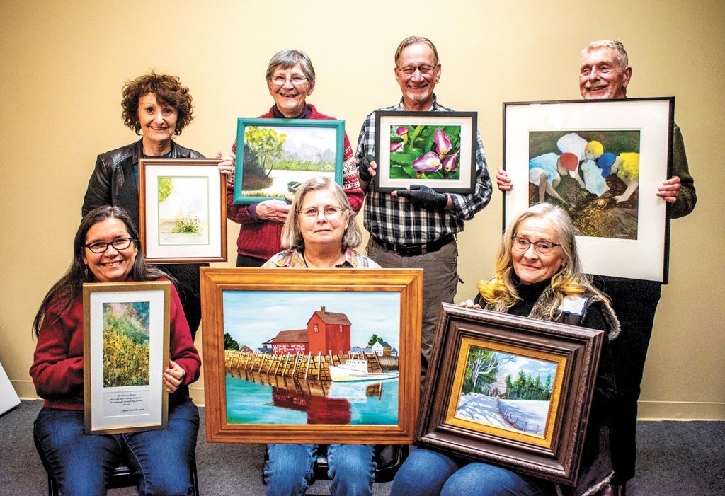 After a long period of time and unable to meet because of COVID-19, members of The Lakes Region Art Association, following the guidelines of wearing masks, and social distancing, were finally able to gather on March 15, for its monthly meeting. One of the scheduled events is member artists bringing to the LRRA Gallery their most recent art, and/or photo to be voted the best by members. Each winner will then have their work on display for a month at area banks, and other institutions, for public viewing. Voted the best for the month of March are, back row, from left, Pat Edsall, Sally Hibberd, Sherwood Frazier, Duane Hammond, front row, from left, Gail Brunt, Barbara McClintock and Martha Aucoin. The LRAA and Gallery is a non-profit 501 C-3 organization. Its goal is to support and promote artists and photographers. The gallery is located in the Tanger Outlet Mall, 120 Laconia Road, Suite 132, Tilton, NH.