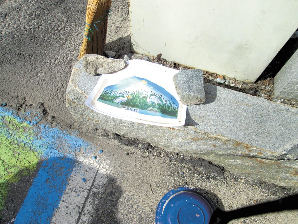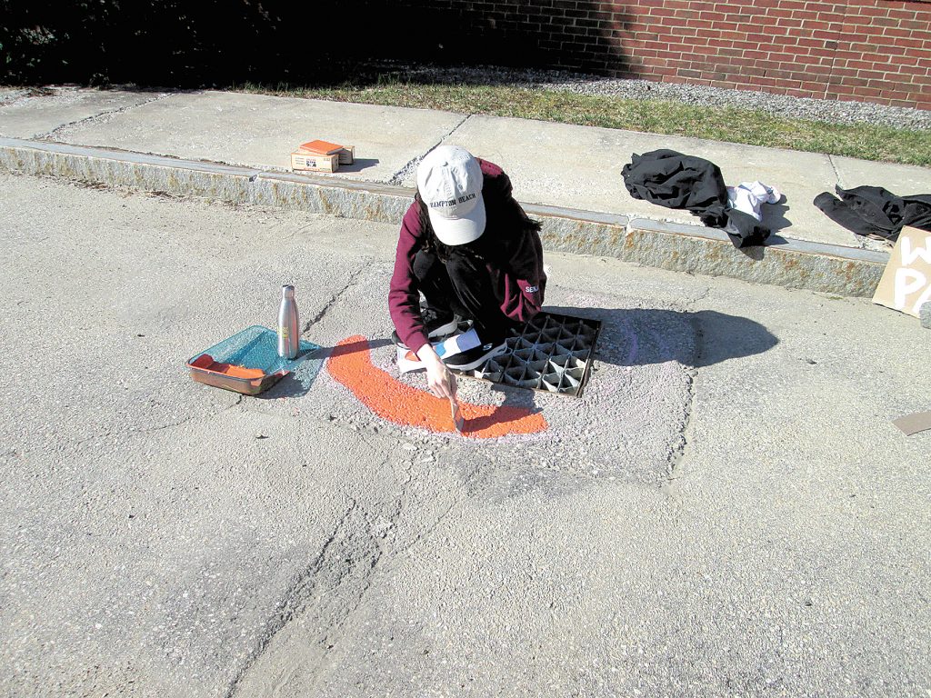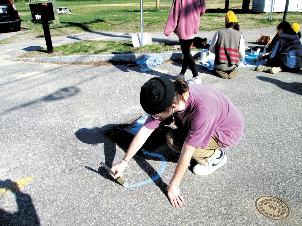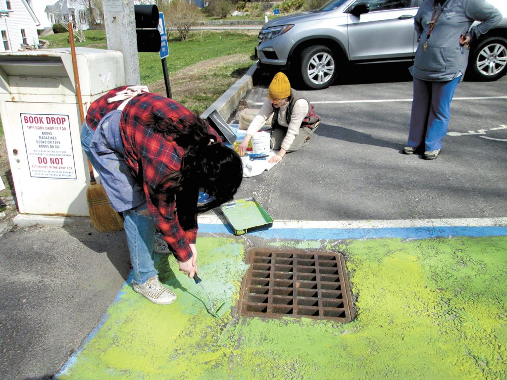 But why just stencil them, Community Center member Donna Crane asked. “Anyone can do that.” Instead, she talked to Wilton-Lyndeborough Cooperative Middle/High School art teacher Emily Hall last fall. A group of seniors took on the project, designing and painting murals. Three of them were chosen and were painted around the drains on Friday, April 22, as part of the town and school Earth Day observances.