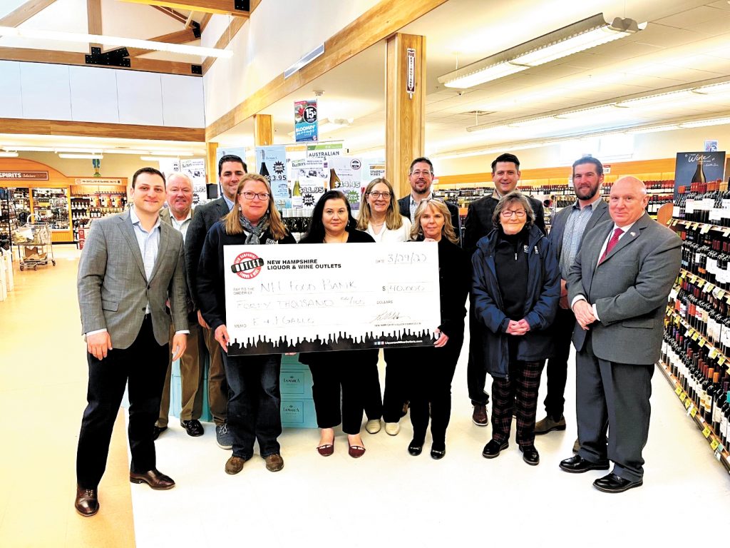 E. & J. Gallo Winery and the New Hampshire Liquor Commission have joined forces once again to fight hunger in the Granite State, this year raising a record $40,000 for the New Hampshire Food Bank. In November and December 2021, E. & J. Gallo Winery donated 50 cents to the New Hampshire Food Bank on sales of select bottles of wine sold at NH Liquor & Wine Outlets. Pictured are, from left, in the front row at the check presentation are Chad Wemischner, E. & J. Gallo Winery business development manager; Eileen Liponis, New Hampshire Food Bank executive director; Lorrie Piper, NHLC director of sales, marketing, merchandising; Lisa Gosselin, NHLC wine marketing and sales specialist; Nancy Mellitt, New Hampshire Food Bank director of development; and Joseph Mollica, NHLC chairman. In the back row, from left, are Tom Kilbride, Pine State Beverage general manager; Paul Sorrentino, E. & J. Gallo Winery Northern area vice president; Nicole Brassard Jordan, NHLC deputy commissioner; Garrett Fardelmann, E. & J. Gallo Winery business development manager; Joe Ricci, Pine State Beverage director of sales and marketing; and Mike Clark, Pine State Beverage retail sales manager.