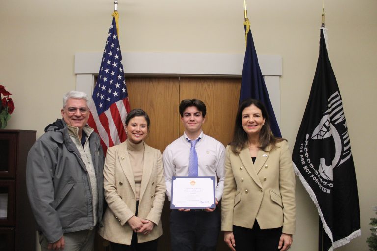 Jacob Daley of Nashua (center) was nominated by Congresswoman Maggie Goodlander (D-NH) for acceptance into the U.S. Naval Academy. He is shown with Goodlander (second from left), Gov. Kelly Ayotte and a family member. Courtesy photo