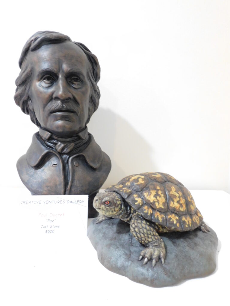 - Sculptor Paul Ducret of Manchester shares “Poe” in cast stone and “Boxy,” a polymer clay turtle displayed at the Small Works – Big Impact exhibit of Nov. 1 – Dec. 21. Photo by LORETTA JACKSON