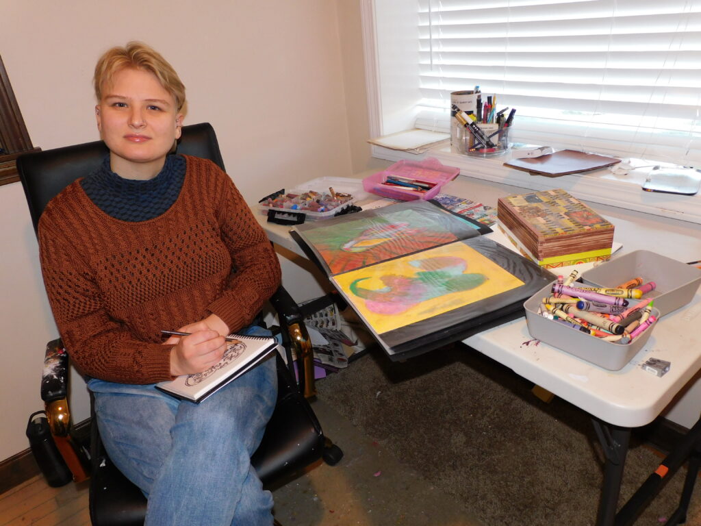 - Lydia Gyurina of Amherst draws accolades for her recent show entry, “Egg Angel,” a vibrant pastel. Photo by LORETTA JACKSON