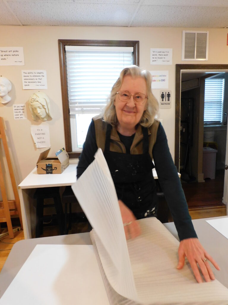 - Gallery owner Betsy Craumer of Bedford wraps a customer’s purchase of an oil painting. Photo by LORETTA JACKSON