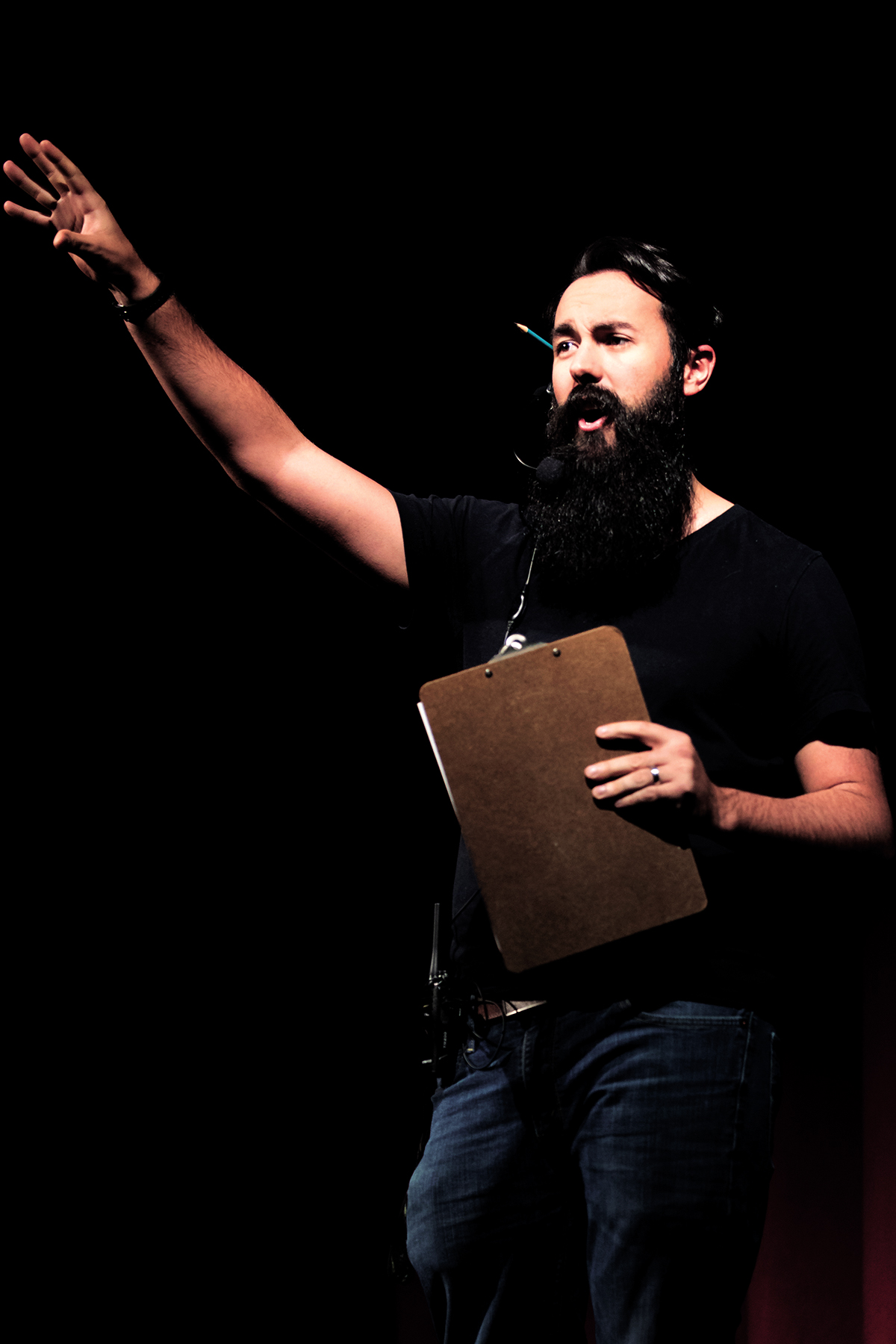 Courtesy photo Leslie Eisenberg Co-conductor Matt Barbosa, teacher of music, theater and dance at Hollis Brookline High School salutes the audience and cast in thanks upon the completion with co-director Claire Pare of the musical, “Mama Mia,” a student-backed stage play that was produced with the help of more than 90 students.