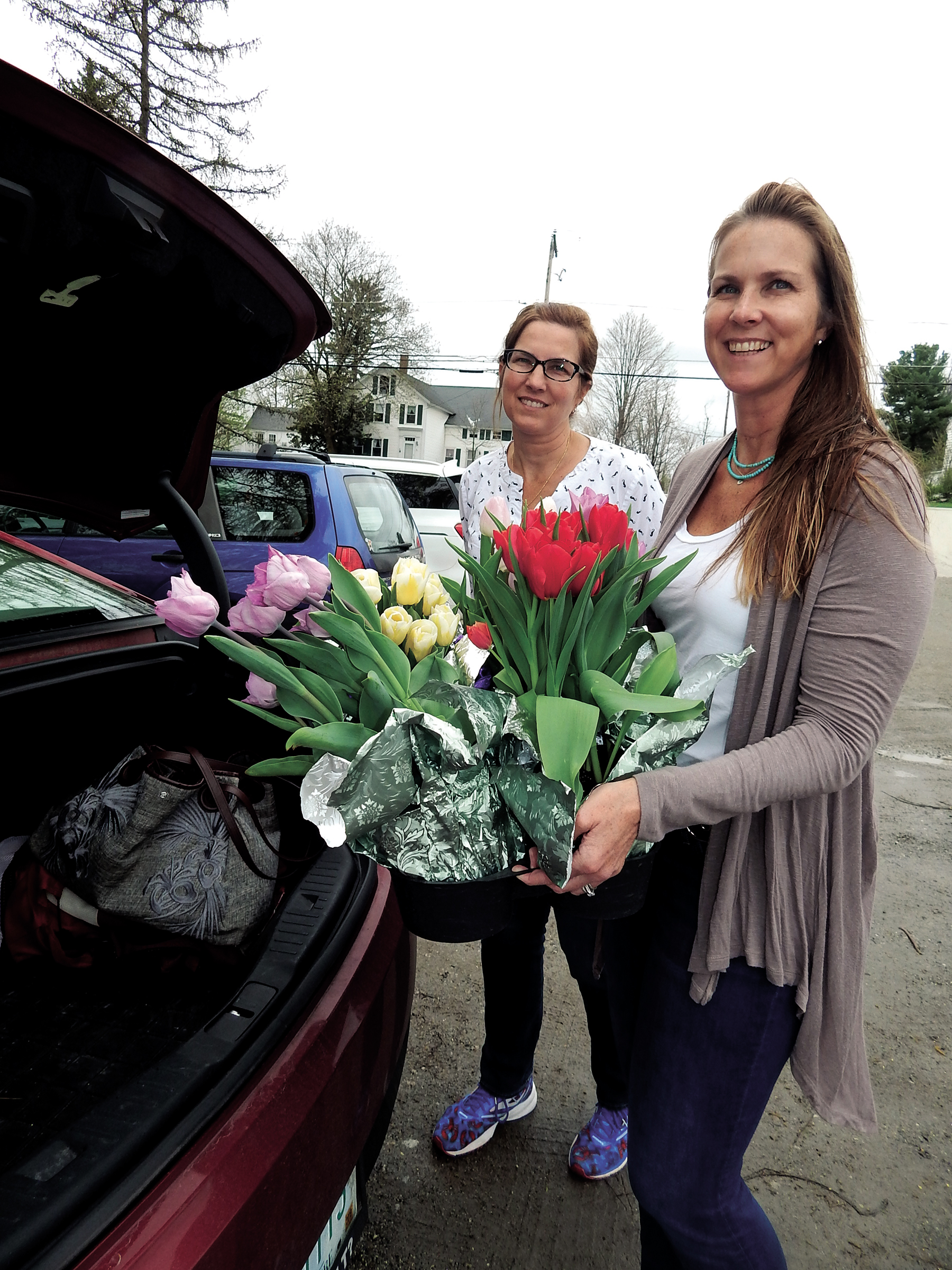 Photo by LORETTA JACKSON Marci Obringer, left, a visitor from Porter, Texas, and her sister, Mandi Sue Bleau, of Hollis, load up some pots of flowers, a collection of five containers filled with tulip plants destined for the family’s Easter celebration.