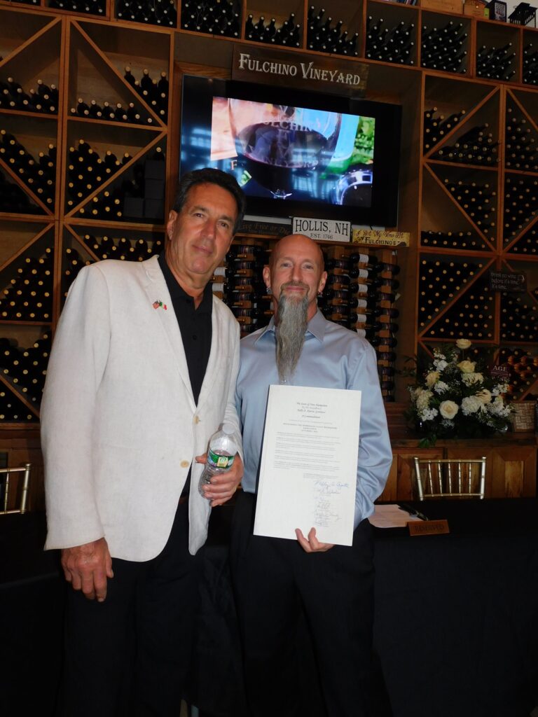 - Fulchino Vineyard co-owner Al Fulchino, left, congratulates Dan Wilson, vice president of the Merrimack Valley Beekeepers Association, who on behalf of the membership accepted an official commendation from Governor Kelly A. Ayotte for the club’s wide variety of conservation efforts on behalf of the pollinators that sustain the world’s food sources and landscapes and agriculture. Photo by LORETTA JACKSON