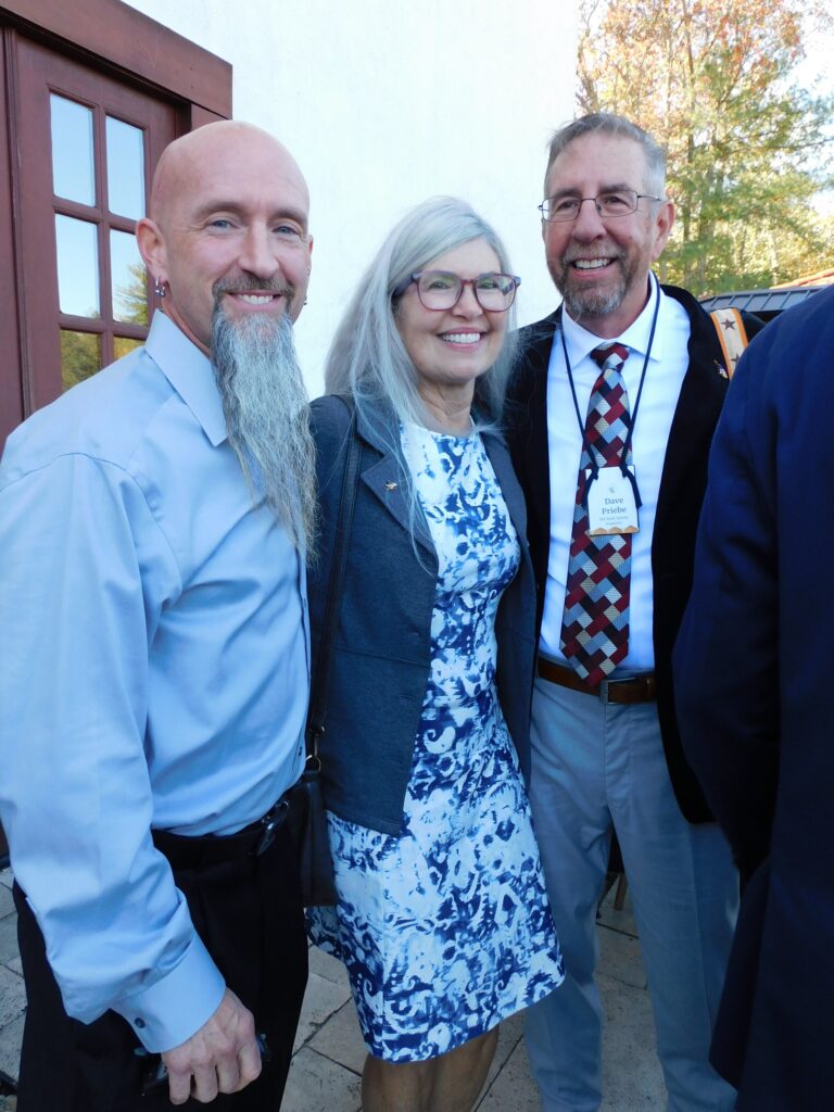- Dan Wilson, left, vice president of the Merrimack Valley Beekeepers Association, is greeted at the recent Roadshow event by Dave Priebe, NH State Apiary Inspector, and his wife, Dorinda Priebe, apiary consultant, both members of Pawtuckaway Beekeepers Association, Concord Area Bee Association and other groups in addition to being Certified Master Beekeepers since 2011 for the Eastern Apiculture Society (EAS), where Dave serves as Master Beekeeper Director sitting on the EAS Board of Directors. The Concord Area club maintains a teaching apiary at the Governor’s mansion. Photo by LORETTA JACKSON