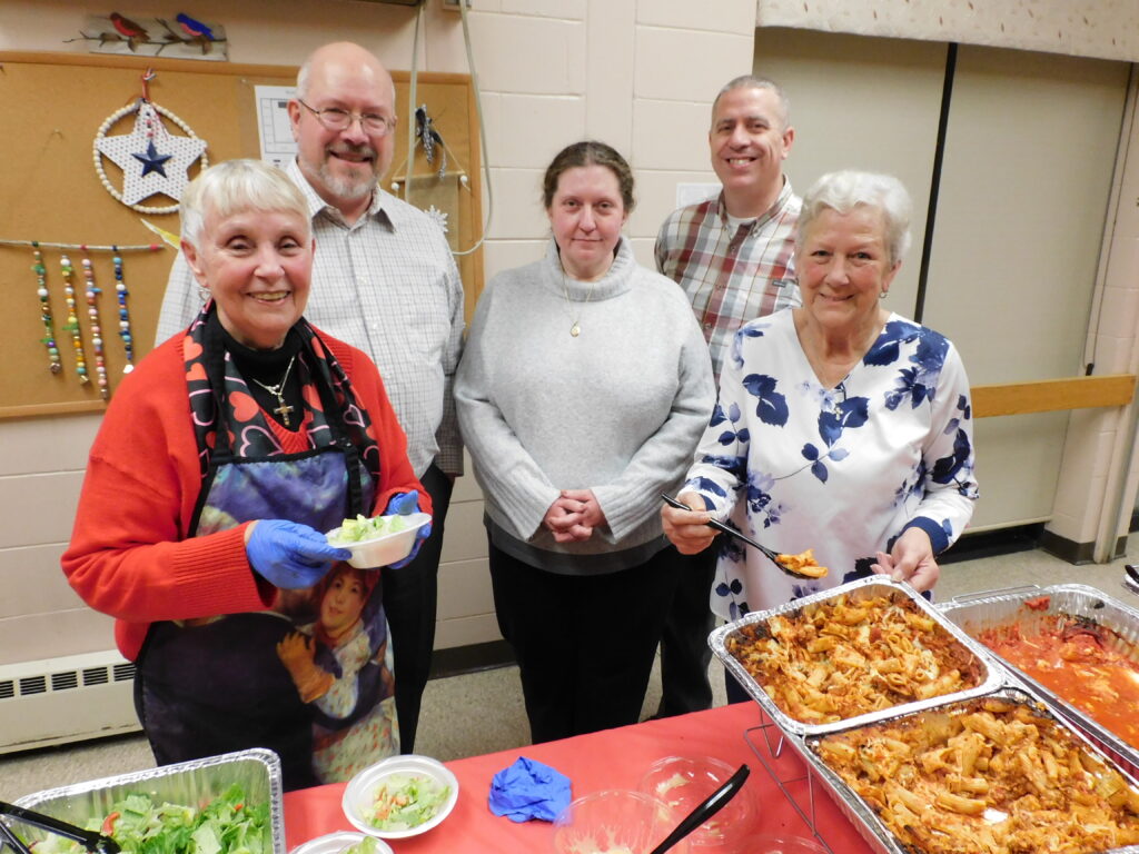 Valentine's Dinner Dance Volunteers, from left, Louise Hickey, Deacon Brian Lester, Jennifer Noury, Brian Noury and Sheila Burnett are manning the tables where the fare provided by Only Catering in Nashua included stuffed shells, sausage with peppers and onions, salads, pastries and desserts. Photo by LORETTA JACKSON