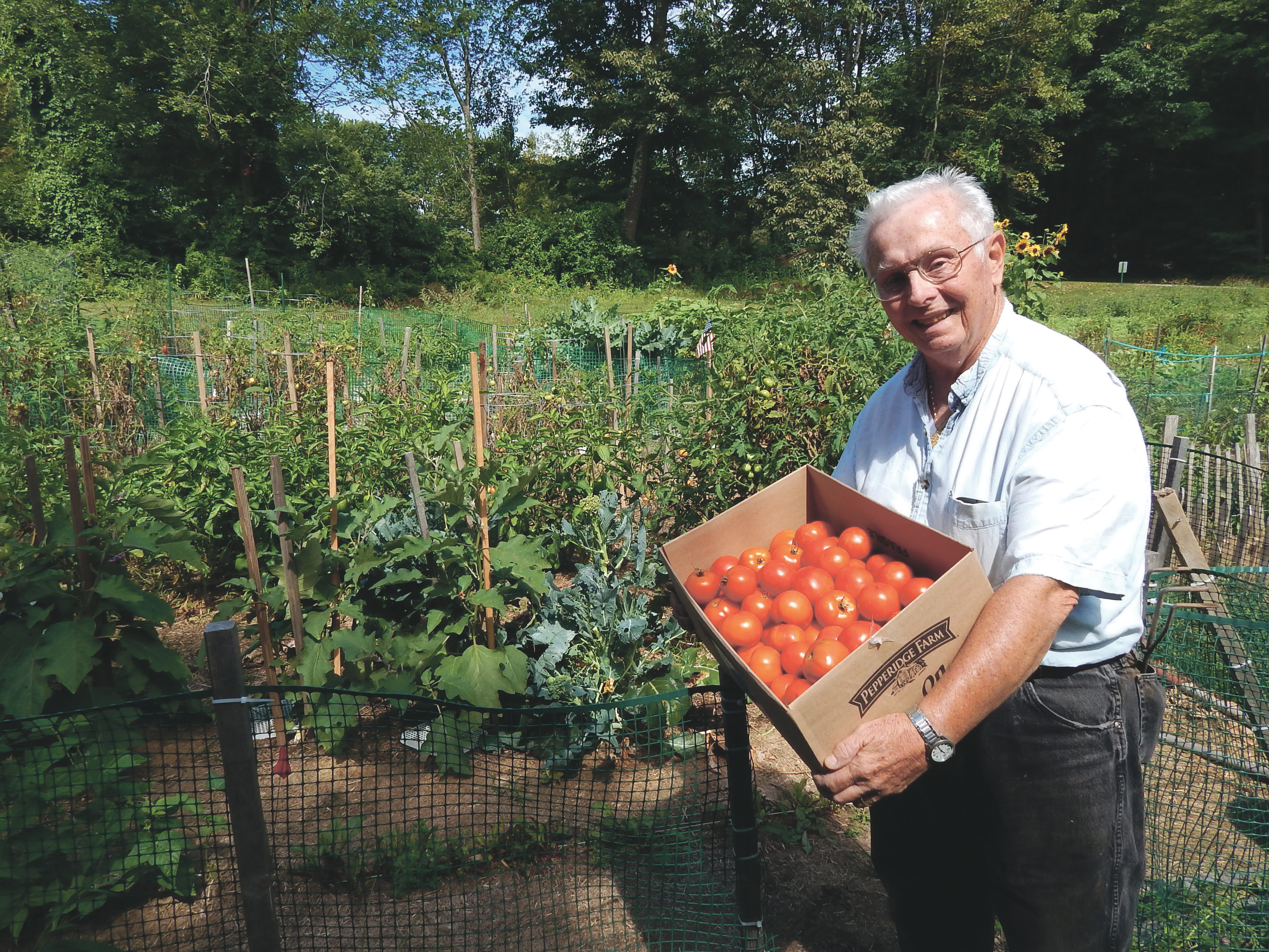 Merrimack’s Tom Hanlon, a former Army radio relay specialist with six years of service during the Vietnam era and time in the National Guard, displays some of the produce that he and his wife, Ellie, grow in the garden plots he annually tends at the Merrimack Community Garden.