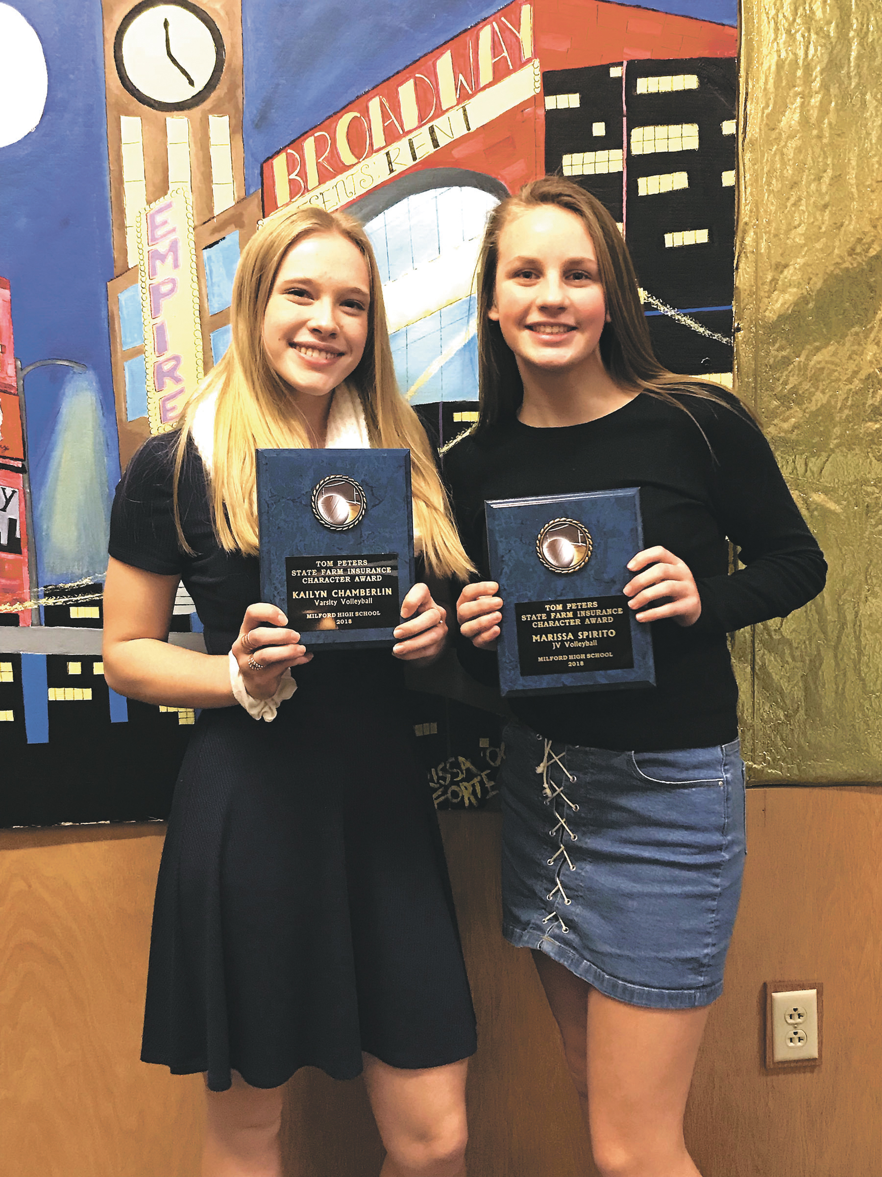 Milford High’s Kailyn Chamberlain, left, won the Tom Peters State Farm Insurance Award for varsity volleyball, while Marissa Spirito was the JV team’s award winner.