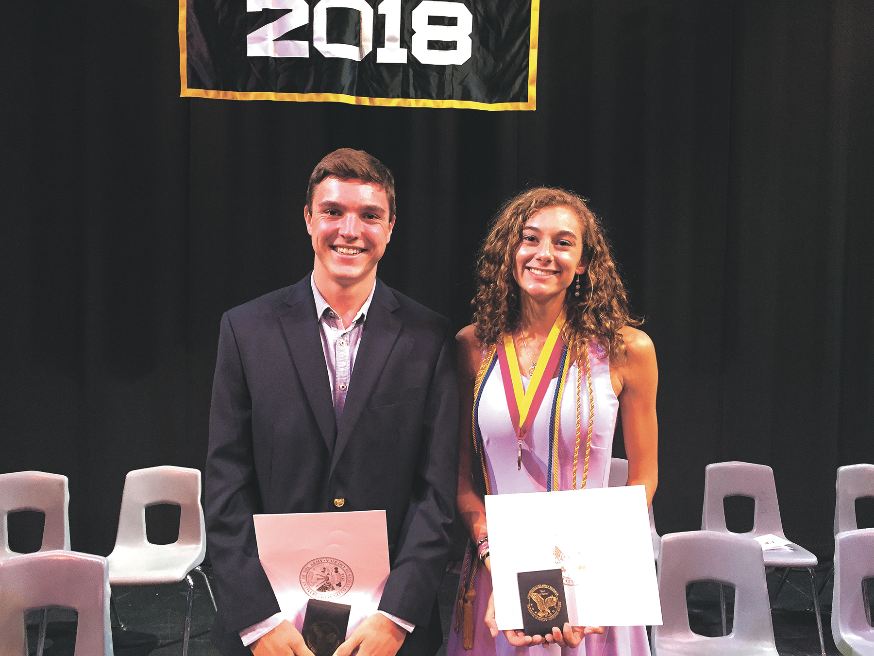 Souhegan seniors Montague Jones and Elise Lambert, above, earned the Army Reserve Scholar-Athlete Award for this school year. Below, Mia Len and Matthew Greany were honored with Senior Sportsmanship Awards.